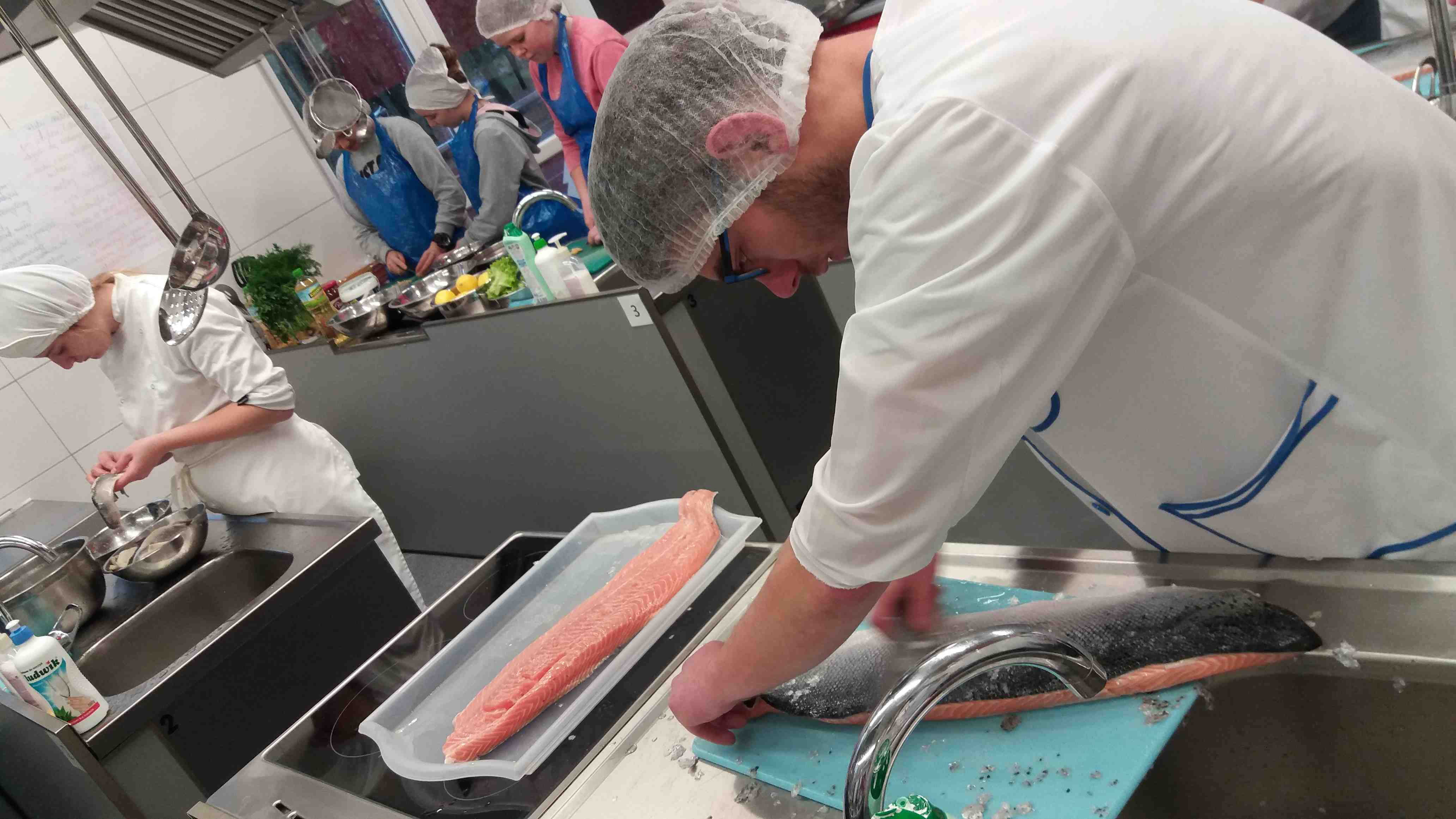 W Powiatowym Zespole Kształcenia Specjalnego w Wejherowie odbyły się warsztaty edukacyjne zorganizowane i sponsorowane przez Krajowy Ośrodek Wsparcia Rolnictwa z Oddziałem Terenowym w Pruszczu Gdańskim. Tematem przewodnim spotkania było przygotowanie tradycyjnych potraw rybnych charakterystycznych dla okresu Świąt Bożego Narodzenia. W warsztatach uczestniczyli uczniowie klasy 3b, 2c oraz licznie przybyłe klasy pierwsze. Przyszli kucharze przygotowywali potrawy z ryb na tradycyjny świąteczny stół. Zajęcia przeprowadził szef kuchni Waldemar Górecki, który na co dzień spotyka się z uczniami podczas zajęć praktycznych w kuchni internackiej, gdzie młodzież Branżowej Szkoły I stopnia odbywa praktyki zawodowe. Uczniowie klas kucharskich pod czujnym okiem szefa przygotowywali na poszczególnych stanowiskach wszystkie potrzebne produkty spożywcze niezbędne do ekspedycji zaproponowanych potraw rybnych. Podczas spotkania przygotowane i zaprezentowane zostały następujące potrawy: filet z dorsza w sosie greckim, śledzik