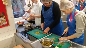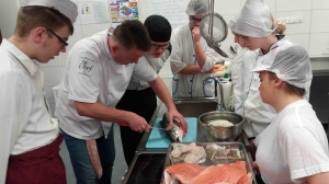 W Powiatowym Zespole Kształcenia Specjalnego w Wejherowie odbyły się warsztaty edukacyjne zorganizowane i sponsorowane przez Krajowy Ośrodek Wsparcia Rolnictwa z Oddziałem Terenowym w Pruszczu Gdańskim. Tematem przewodnim spotkania było przygotowanie tradycyjnych potraw rybnych charakterystycznych dla okresu Świąt Bożego Narodzenia. W warsztatach uczestniczyli uczniowie klasy 3b, 2c oraz licznie przybyłe klasy pierwsze. Przyszli kucharze przygotowywali potrawy z ryb na tradycyjny świąteczny stół. Zajęcia przeprowadził szef kuchni Waldemar Górecki, który na co dzień spotyka się z uczniami podczas zajęć praktycznych w kuchni internackiej, gdzie młodzież Branżowej Szkoły I stopnia odbywa praktyki zawodowe. Uczniowie klas kucharskich pod czujnym okiem szefa przygotowywali na poszczególnych stanowiskach wszystkie potrzebne produkty spożywcze niezbędne do ekspedycji zaproponowanych potraw rybnych. Podczas spotkania przygotowane i zaprezentowane zostały następujące potrawy: filet z dorsza w sosie greckim, śledzik