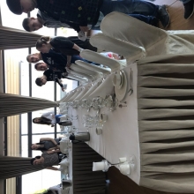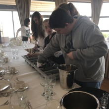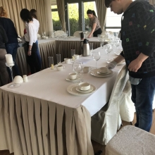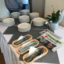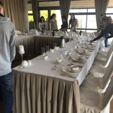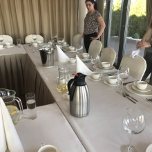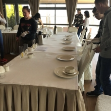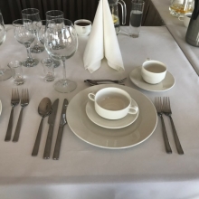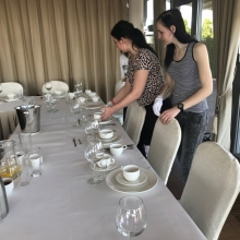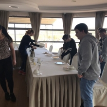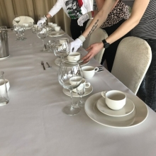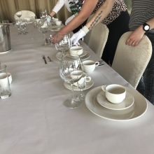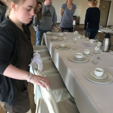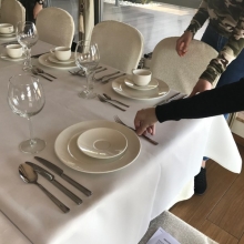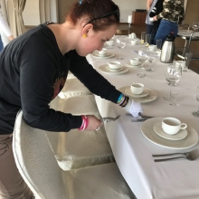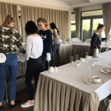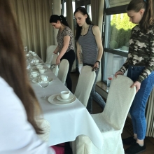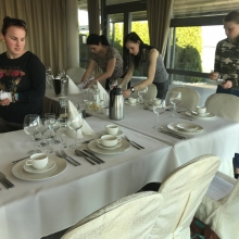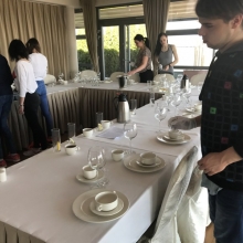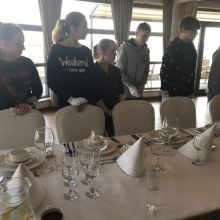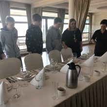 Zaczynając od głuchego telefonu z uśmiechem na twarzy zaczęliśmy ćwiczenia. Młodzież poznała zasady nakrywania stołu na przyjęcia okolicznościowe np. wesela, komunie, urodziny oraz zasady obsługi gościa indywidualnego. Każdy sam musiał nakryć stół na przyjęcie zaczynając od talerza, podstawki, bulionówki, noża, widelca, widelczyka, łyżeczki, łyżki, gobletu, kieliszka do alkoholu itd. kończąc na bankietówce. Bankietówka, inaczej serweta konsumencka i jej wymyślne kształty można było zaobserwować na stole podczas zajęć. Spotkanie zakończyło się wspólnym zdjęciem zadowolonej, uśmiechniętej młodzieży wraz z opiekunami panią Angeliką Matuszczak i Dagmarą Maciejewską.