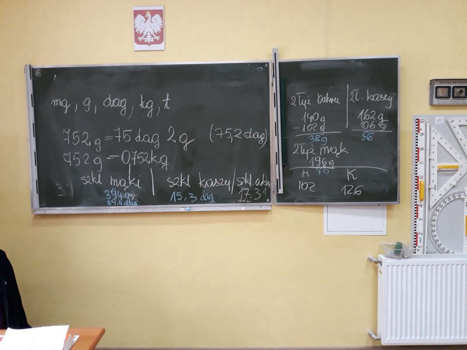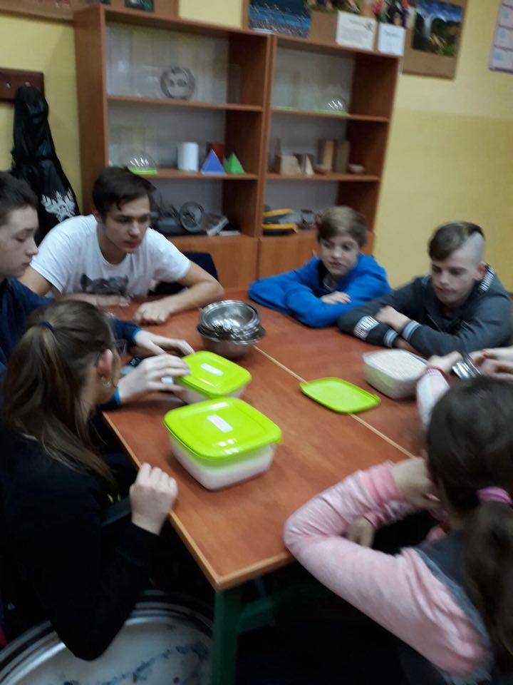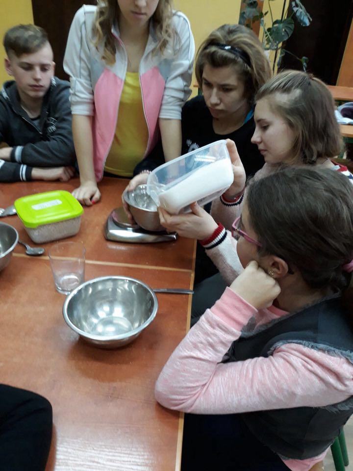 Uczniowie klasy 7 a SP (Klub „ Rozsądnych Jadłożerców) uczestniczyli w lekcji pt: ”Ważenie produktów oraz zamiana jednostek masy”. Uczniowie podczas zajęć, uczyli się odmierzać takie produkty jak mąka, cukier, ryż według poleceń nauczyciela p. M. Barzowskiej. Dodatkowym zadaniem była zamiana jednostek masy – dekagramów na gramy, kilogramów na dekagramy itp. Uczniowie wykazywali duże zaangażowanie i stwierdzili, że podczas praktycznych lekcji szybciej przyswajają wiedzę.