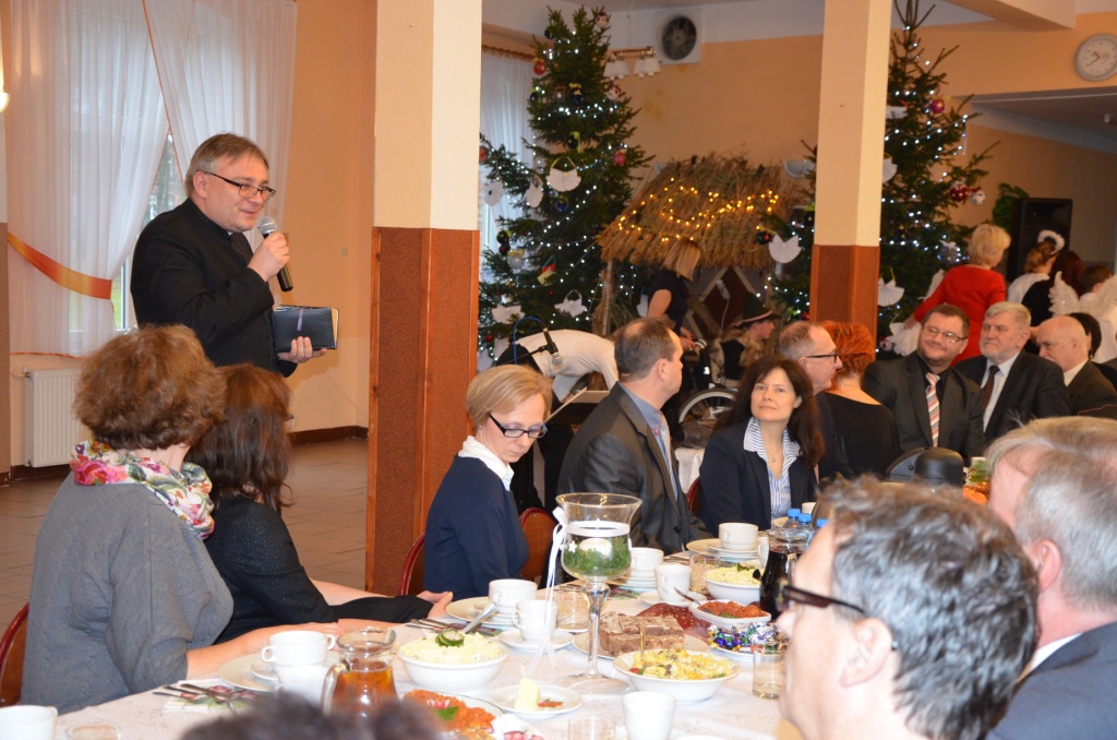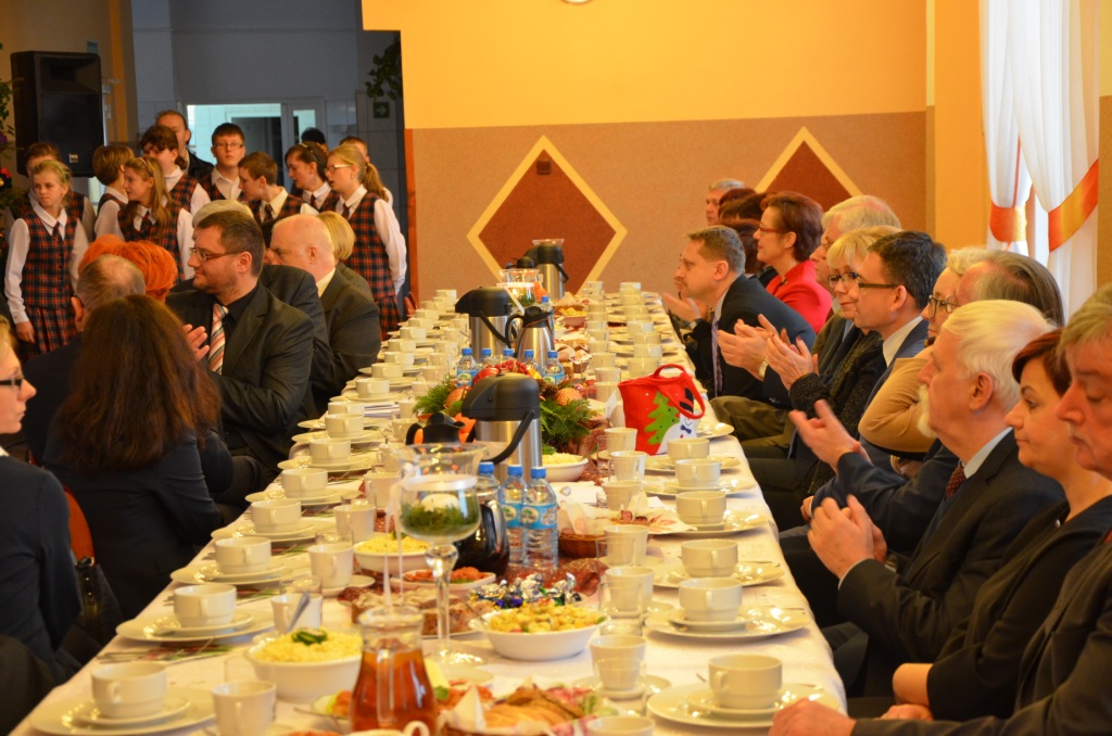 Na spotkanie wigilijne przybyli: dyrektorzy i wicedyrektorzy szkół i placówek oświatowych, placówek opiekuńczo-wychowawczych i DPS, dyrektor PCPR, PUP i Muzeum P i MK-P. Gości powitała pani Małgorzata Woźniak – dyrektor PZKS. Kolejnym punktem spotkania był występ uczniów szkoły podstawowej i gimnazjum. W programie znalazły się następujące utwory: