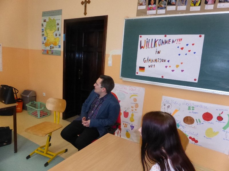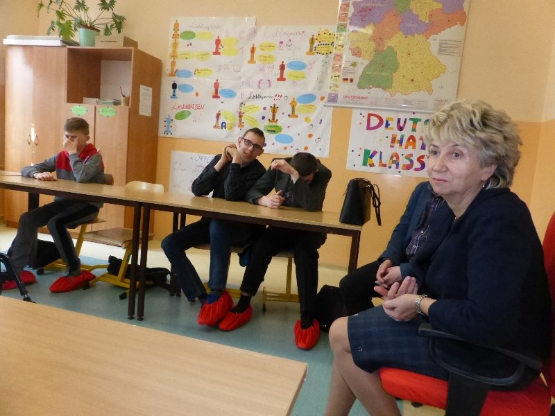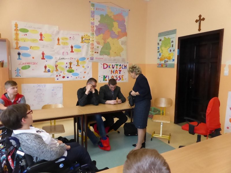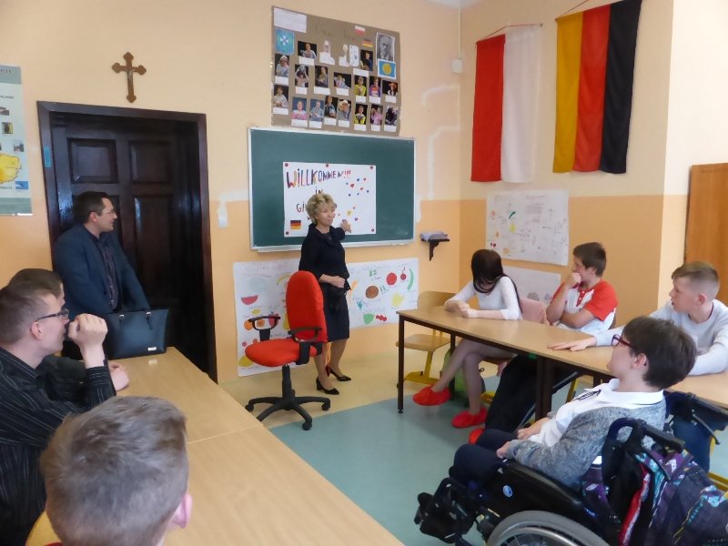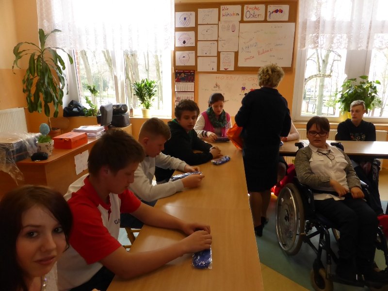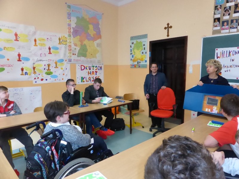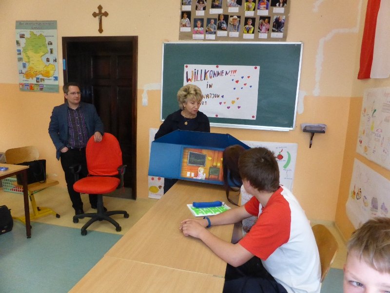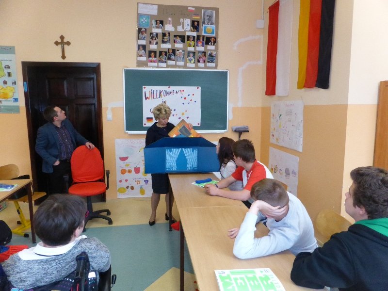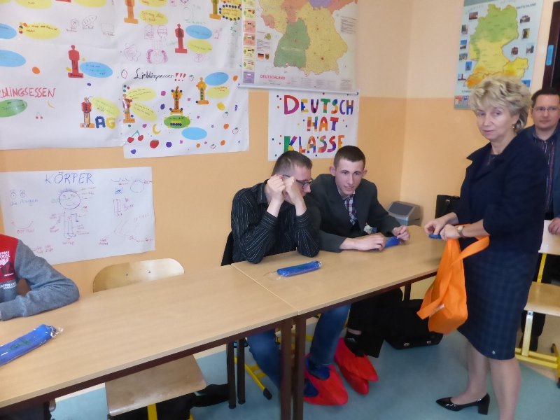 W poniedziałek 10 kwietnia gościliśmy w naszym gimnazjum przedstawicieli Goethe- Institut z Warszawy. Obecni byli pani Ewa Ostaszewska i pan Andrzej Pomianowski. Niestety nie udało się nam zakwalifikować do ścisłego finału konkursu, niemniej jednak członkowie komisji konkursowej, będący pod wrażeniem wysiłku i wkładu naszej pracy w zmiany aranżacji sali języka niemieckiego, osobiście chcieli poznać naszą grupę projektową oraz wręczyć uczestnikom drobne upominki. Spotkanie z młodzieżą odbyło się oczywiście w sali języka niemieckiego nr 107 w budynku ZSZ nr 5. Uczniowie opowiadali o projekcie, w jaki sposób przebiegała jego realizacja, demonstrowali swoje prace, odpowiadali na wiele pytań komisji. Niedługo otrzymamy drogą pocztową dyplomy oraz list z podziękowaniami, który zostanie odczytany na apelu szkolnym.