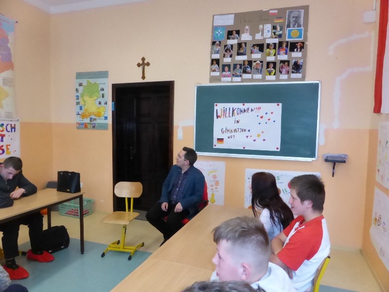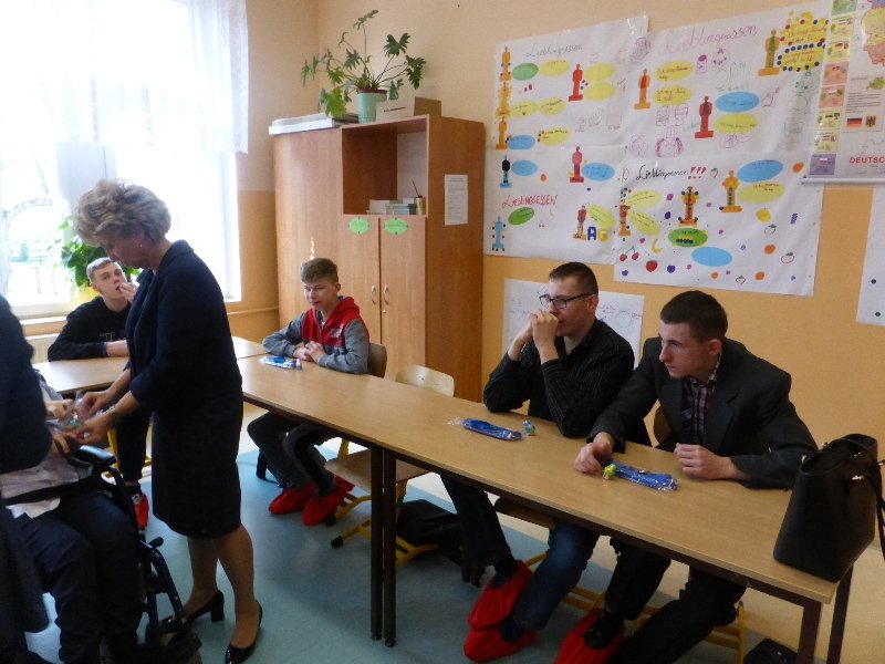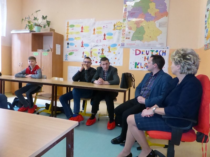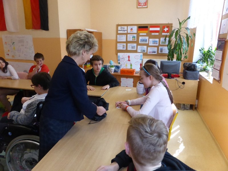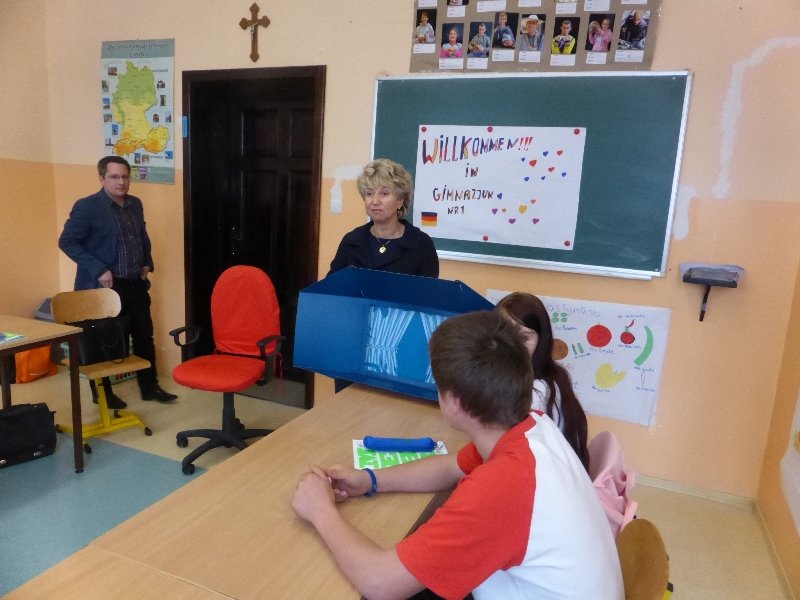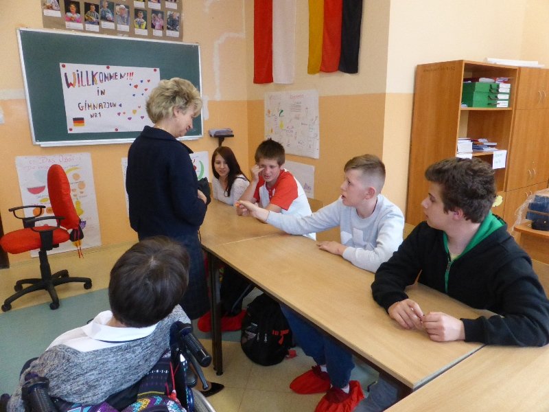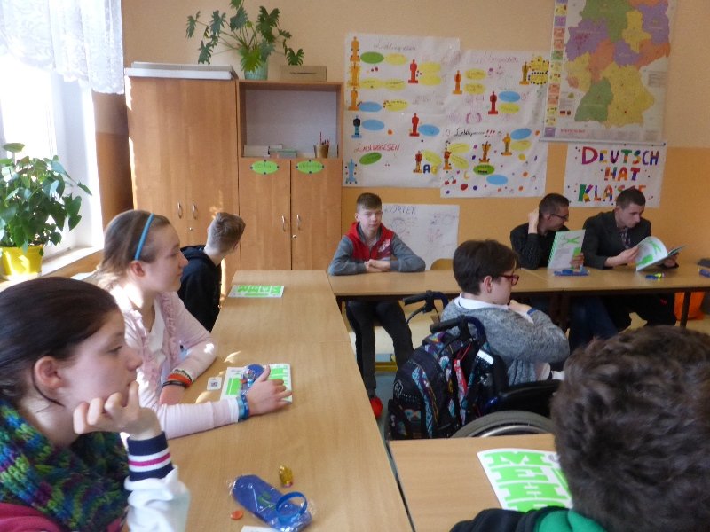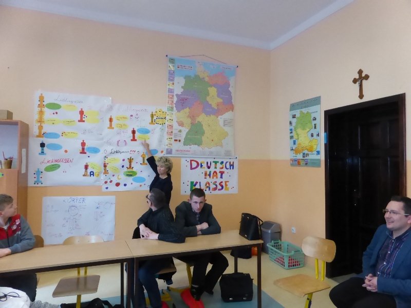 W poniedziałek 10 kwietnia gościliśmy w naszym gimnazjum przedstawicieli Goethe- Institut z Warszawy. Obecni byli pani Ewa Ostaszewska i pan Andrzej Pomianowski. Niestety nie udało się nam zakwalifikować do ścisłego finału konkursu, niemniej jednak członkowie komisji konkursowej, będący pod wrażeniem wysiłku i wkładu naszej pracy w zmiany aranżacji sali języka niemieckiego, osobiście chcieli poznać naszą grupę projektową oraz wręczyć uczestnikom drobne upominki. Spotkanie z młodzieżą odbyło się oczywiście w sali języka niemieckiego nr 107 w budynku ZSZ nr 5. Uczniowie opowiadali o projekcie, w jaki sposób przebiegała jego realizacja, demonstrowali swoje prace, odpowiadali na wiele pytań komisji. Niedługo otrzymamy drogą pocztową dyplomy oraz list z podziękowaniami, który zostanie odczytany na apelu szkolnym.