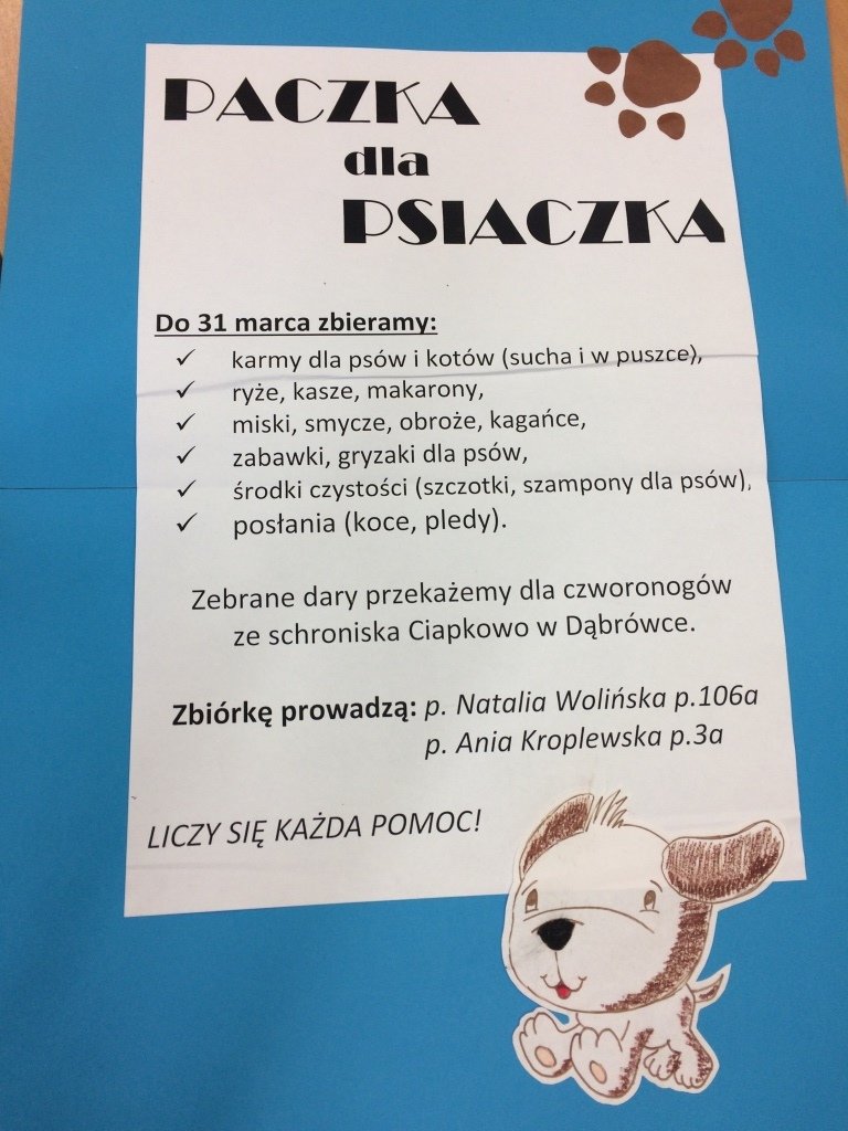 W lutym i marcu p. Natalia Wolińska i p. Ania Kroplewska prowadziły zbiórkę dla czworonogów ze Schroniska dla bezdomnych zwierząt w Dąbrówce.