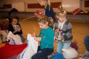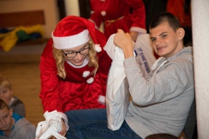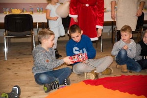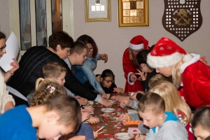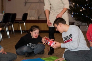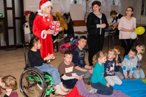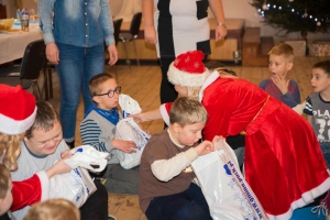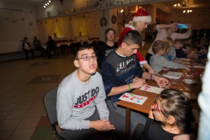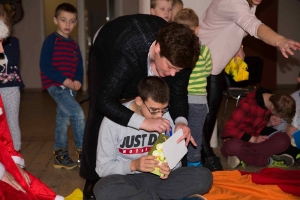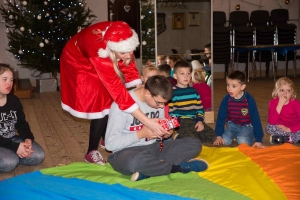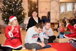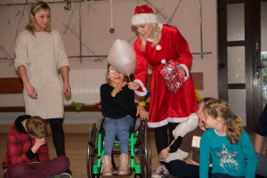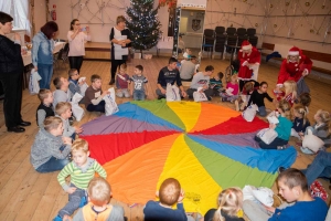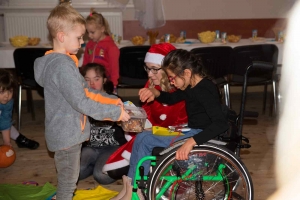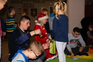 Jak co roku, tym razem 10 grudnia 2019r., nasi podopieczni z klasy II/IIIa oraz VII/VIIIa odwiedzili Wiejski Klub Kultury w Leśniewie gdzie spotkali się z wychowankami miejscowego przedszkola. Spotkanie rozpoczęliśmy od wspólnego przywitania się oraz wysłuchania opowiadania o „Brzydkim kaczątku”. Dużo radości sprawiły dzieciom, ale i dorosłym zabawy z wykorzystaniem chusty Klanzy oraz wspólne wykonywanie świątecznych kartek. Uczniowie otrzymali podarunki od wychowanków przedszkola, ale również od Mikołaja co uradowało naszych podopiecznych. Niespodzianką była też wata cukrowa, która wywołała duży uśmiech na twarzach dzieci. Spotkanie przebiegało w przemiłej świątecznej atmosferze, pełnej integracji i wzajemnej życzliwości.