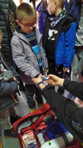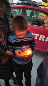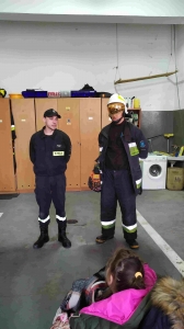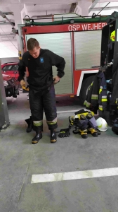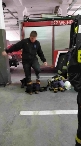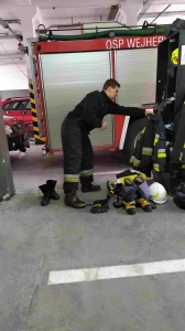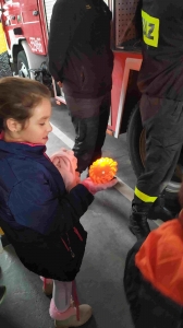 Podczas spotkania strażacy zapoznali nas z ciekawostkami związanymi z ich pracą zawodową. Dowiedzieliśmy się, że Straż wzywamy nie tylko do pożaru, ale również do wypadków, podtopień, połamanych drzew i innych zdarzeń losowych. Mięliśmy także okazję przekonać się, jak błyskawicznie strażak przebiera się w strój bojowyJ