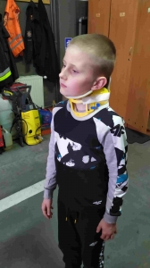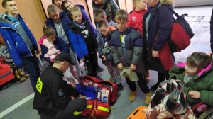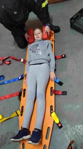W trakcie wizyty mogliśmy z bliska obejrzeć strój strażaka, a także poznać wyposażenie wozu strażackiego oraz sprzęt, jaki używa strażak w czasie akcji ratunkowych. Podczas prezentacji sprzętu, jedna z naszych dzielnych koleżanek wzięła udział w ćwiczeniach i pokazie umieszczania i przenoszenia na noszach poszkodowanego.