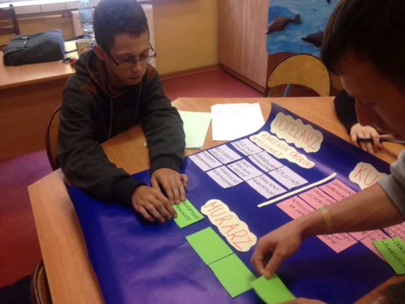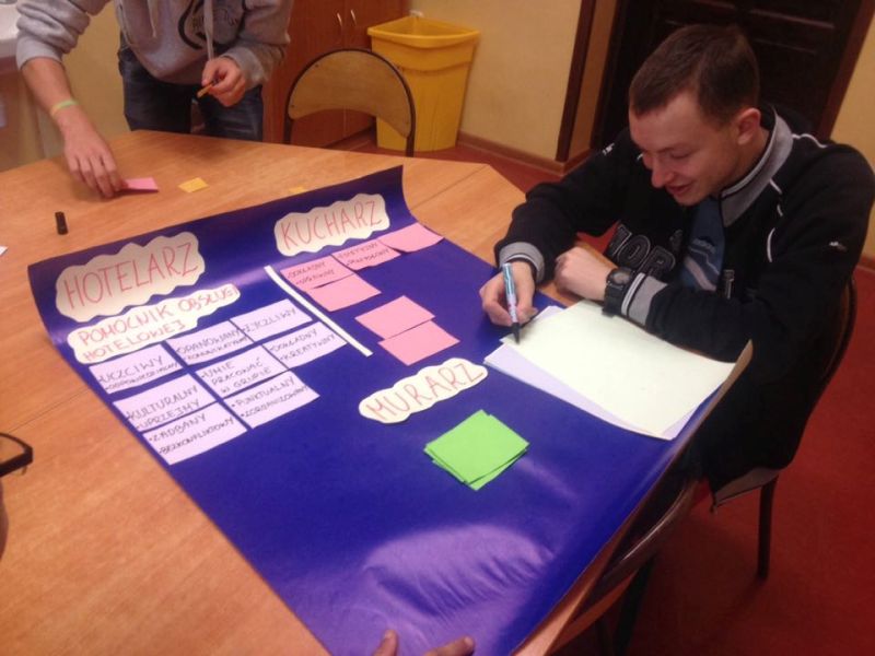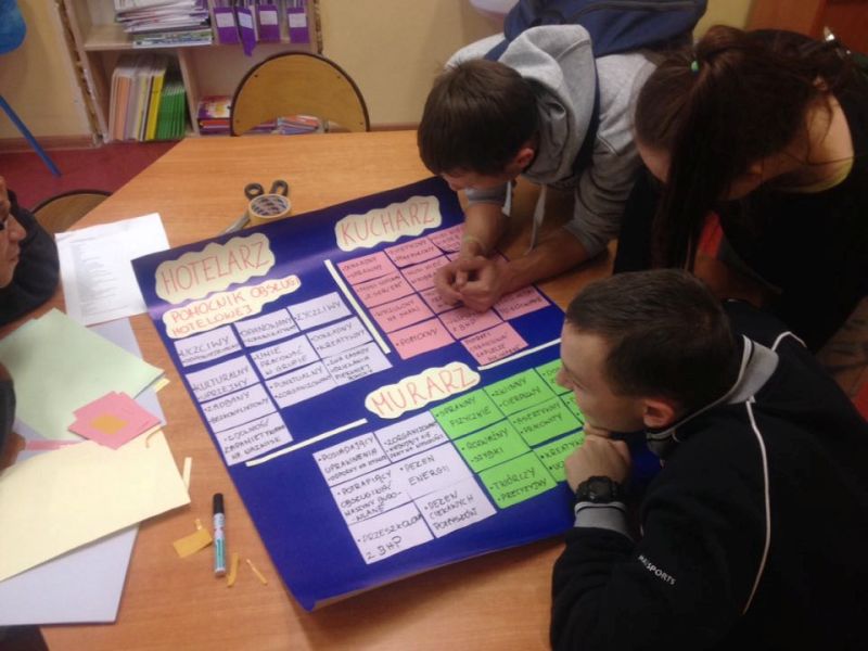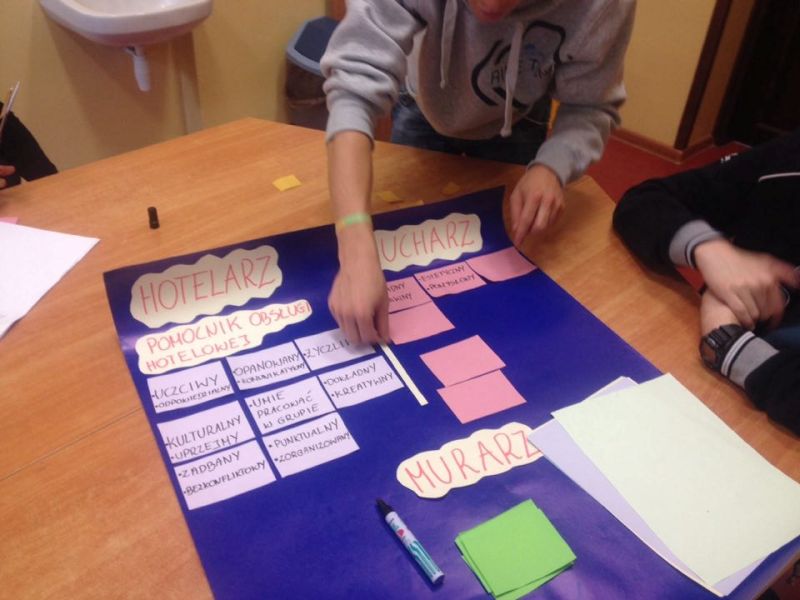 Zajęcia z doradztwa zawodowego cieszą się dużym zainteresowaniem. Dzisiejszego dnia tzn. 18 października, uczniowie wykonywali plakat na gazetkę nt. wymagań na stanowiska pracy w zawodzie kucharz, murarz i pomocnik obsługi hotelowej. Wypisywali cechy osobowości pracownika wyżej wymienionych zawodów, dokładnie dobierając i selekcjonując przykłady do każdego z nich. Ukończony plakat zostanie powieszony na tablicy w holu szkoły. Zachęcamy więc wszystkich uczniów do czytania gazetek, a w szczególności przyszłych absolwentów każdego z kierunków kształcenia w Branżowej Szkoły I stopnia Specjalnej nr 5.